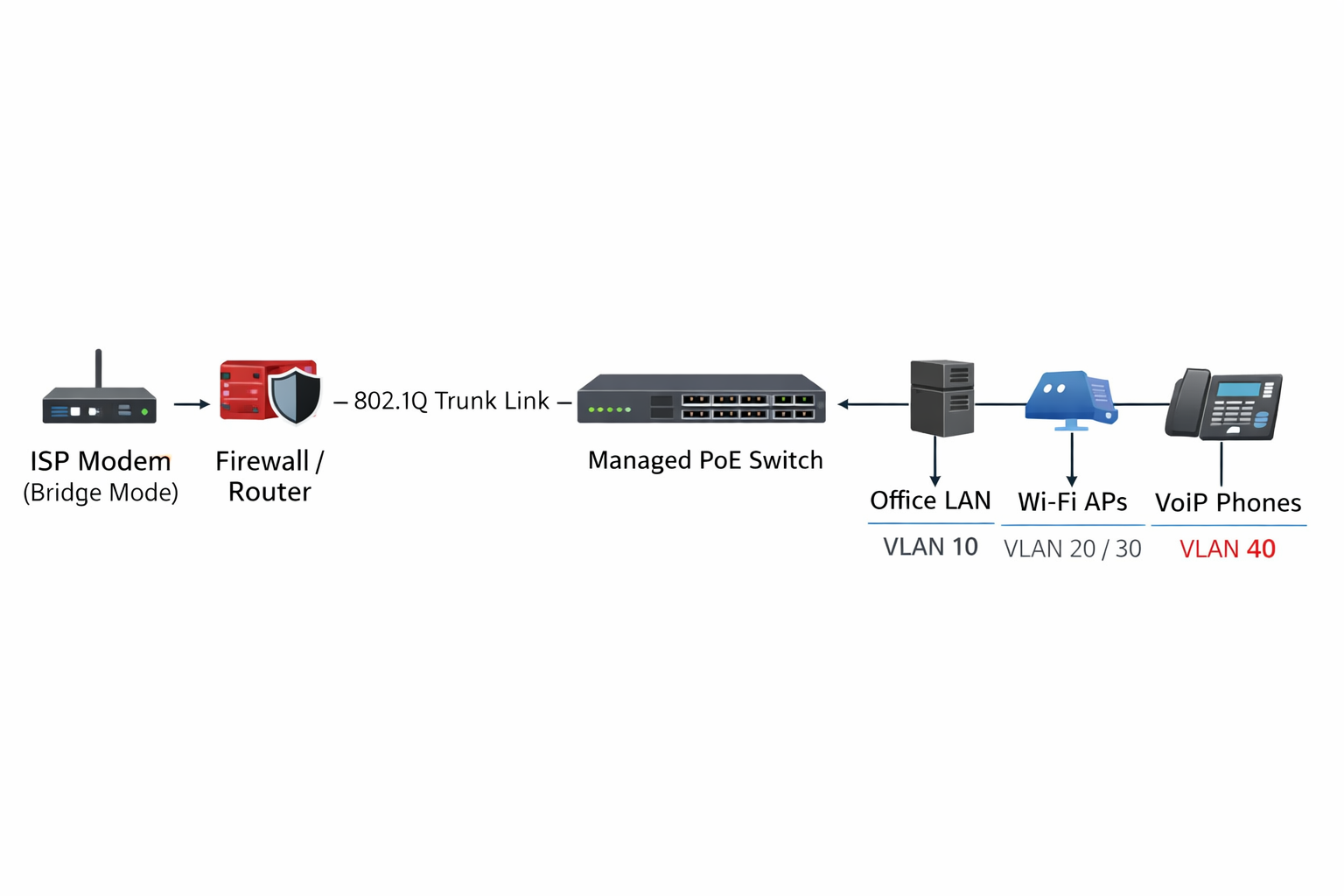 [ ISP Modem (Bridge Mode) ] | [ Firewall / Router ] | 802.1Q Trunk Link | [ Managed PoE Switch ] | | | Office LAN Wi-Fi APs VoIP Phones VLAN 10 VLAN 20/30 VLAN 40